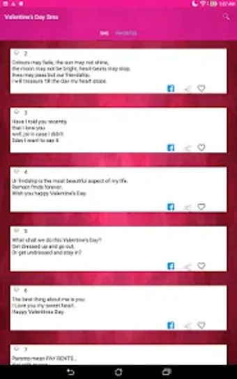 이 앱은 텍스트 메시지로 보낼 수 있는 부드러운 메시지의 거대한 컬렉션을 보유하고 있으며 소셜 네트워크에서 공유할 수도 있습니다. 발렌타인데이에 당신의 사랑하는 사람을 행복하게 만들고, 좋은 하루를 기원하거나 그들에게 사랑한다고 말하고 싶다면 발렌타인데이 문자 메시지가 도움이 될 것입니다. 이 앱은 탐색하기 쉽고 어떤 기념일에도 완벽한 메시지를 빠르게 찾을 수 있습니다.
